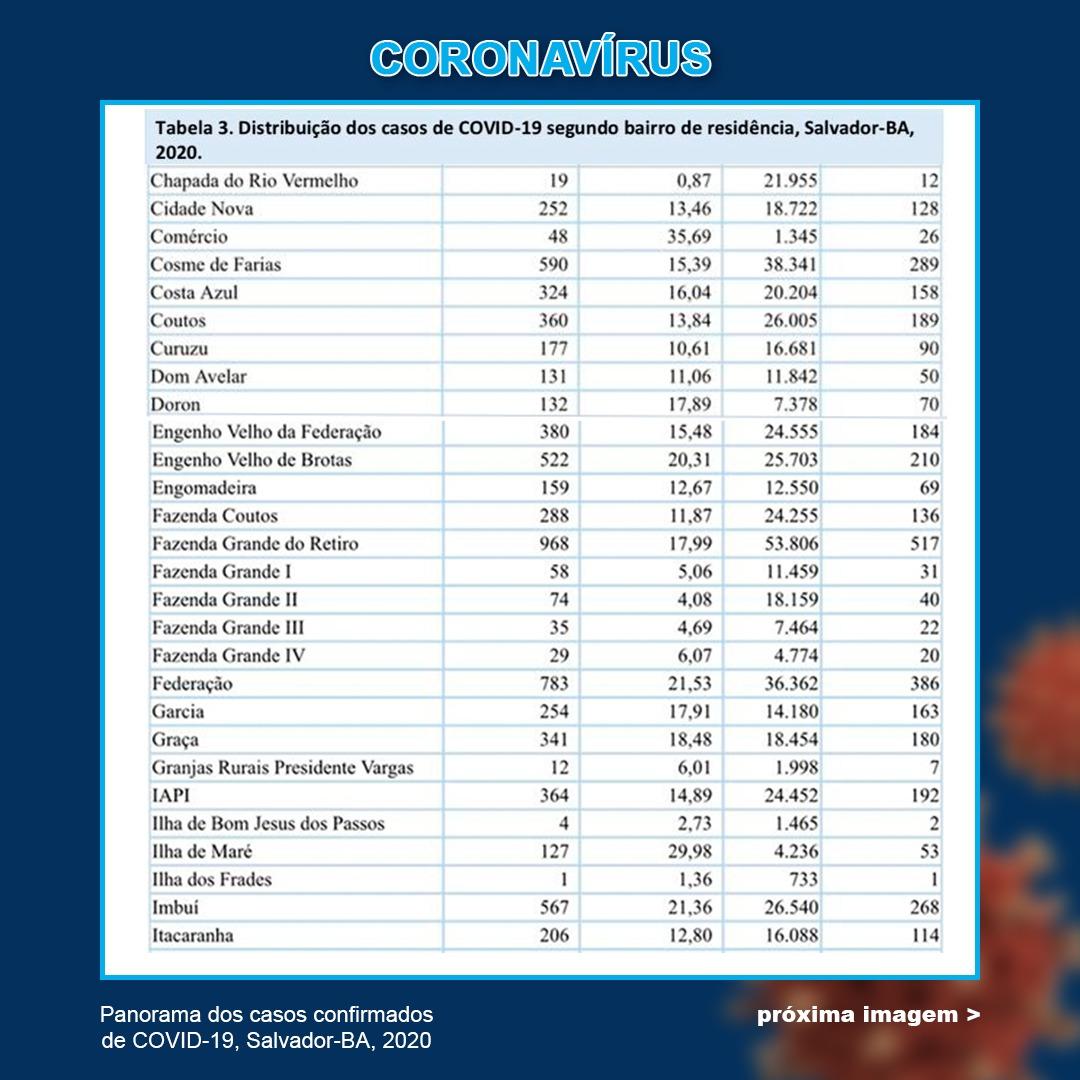 Até o momento, a Pituba ainda se mantém como o bairro da capital com mais infectados registrados: 1.318 no total; seguido por Brotas, com 1.307 casos, e Pernambués, com 1.155.