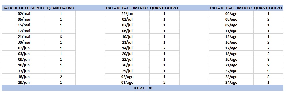 O boletim epidemiológico desta terça contabiliza 70 óbitos que ocorreram em diversas datas, conforme tabela abaixo. A existência de registros tardios e/ou acúmulo de casos deve-se a sobrecarga das equipes de investigação, pois há doenças de notificação compulsória para além da covid-19.
