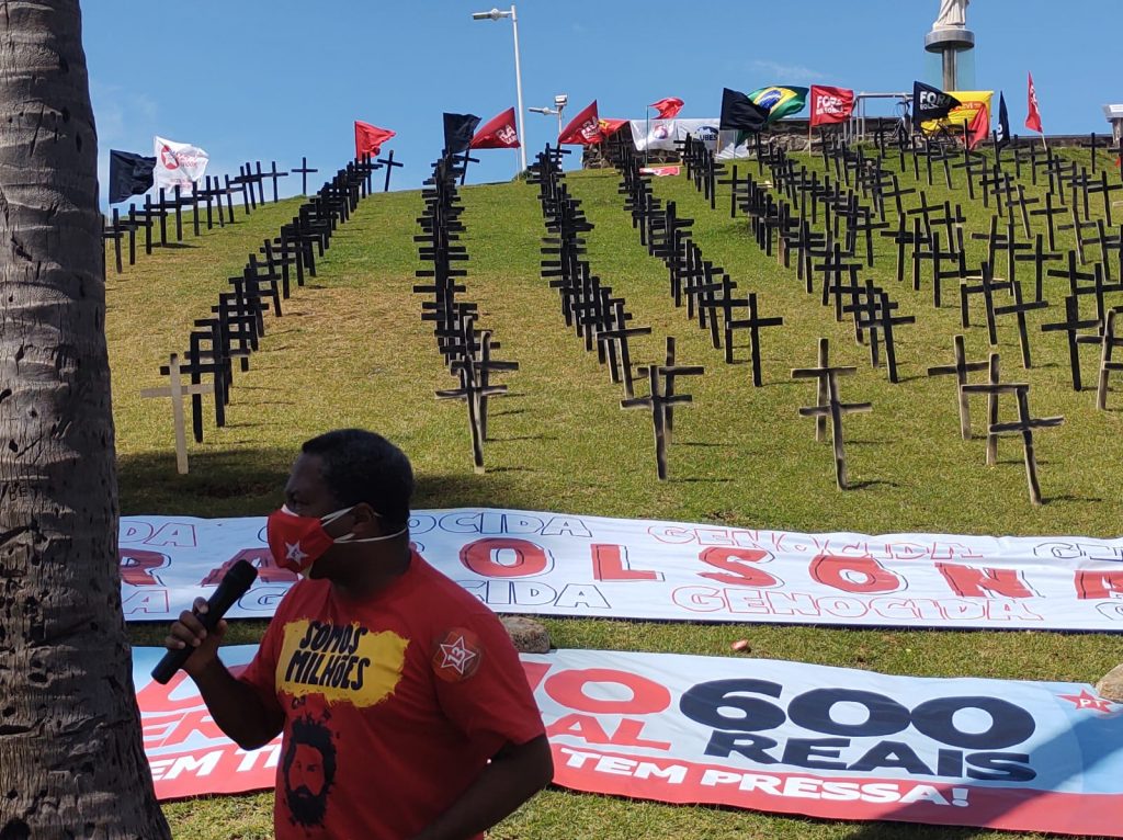 “Este ato simbólico é para lembrar as mais de 330 mil mortes durante a pandemia, que poderiam ter sido evitadas caso Bolsonaro não tivesse adotado, ao longo do ano, atitudes que contrariaram as recomendações da OMS e outros órgãos, desprezando a gravidade da situação. São 330 cruzes, cada uma delas simbolizando mil mortes ocorridas até o momento”