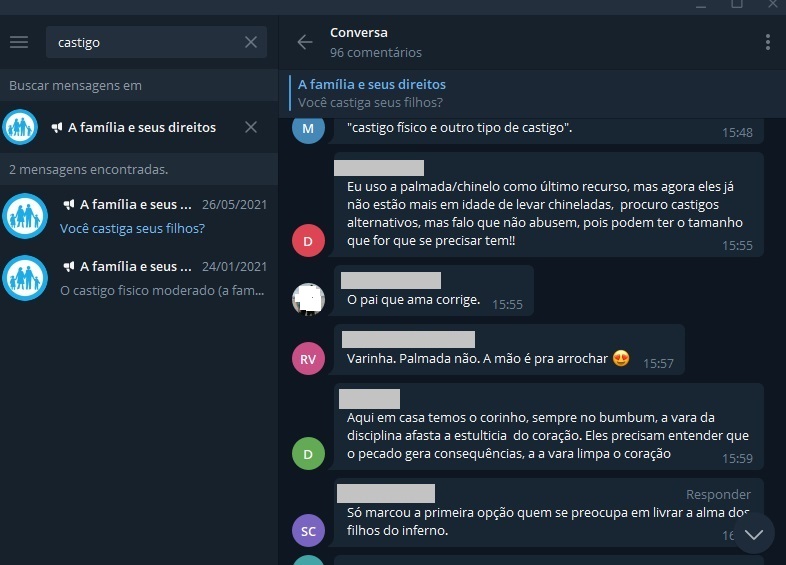 No grupo de Moreira no Telegram, chamado “A família e seus direitos” – que tem mais de 10,8 mil inscritos -, uma enquete sobre castigos físicos foi lançada em maio de 2021; Das 664 respostas, 51% marcaram que “sim, eu uso castigo físico (p. ex. palmadas)”.