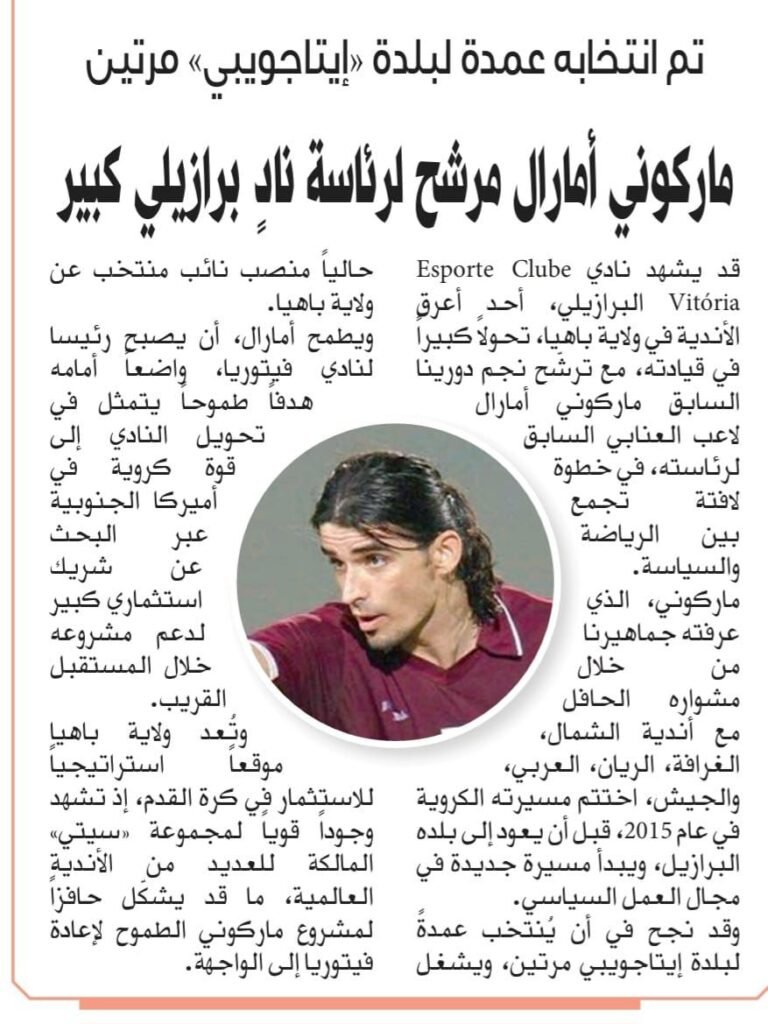 A disputa pela presidência do Esporte Clube Vitória ultrapassou as fronteiras do Brasil e ganhou repercussão no Oriente Médio. Nesta quinta-feira (11), o tradicional jornal Al-Watan, do Qatar, publicou uma matéria destacando a possibilidade de Marcone Amaral, ex-zagueiro da Seleção do país, assumir o comando do clube baiano. A publicação ressaltou a importância histórica do […]