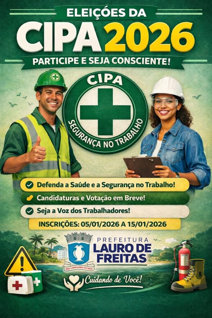 A Prefeitura de Lauro de Freitas, por meio da Secretaria Municipal de Administração (SECAD), informa que, a partir do dia 5 de janeiro, estarão oficialmente abertas as inscrições para os servidores concorrerem à eleição da Comissão Interna de Prevenção de Acidentes e Assédio (CIPA), gestão 2026. Servidores nomeados e efetivos de todas as secretarias, interessados […]