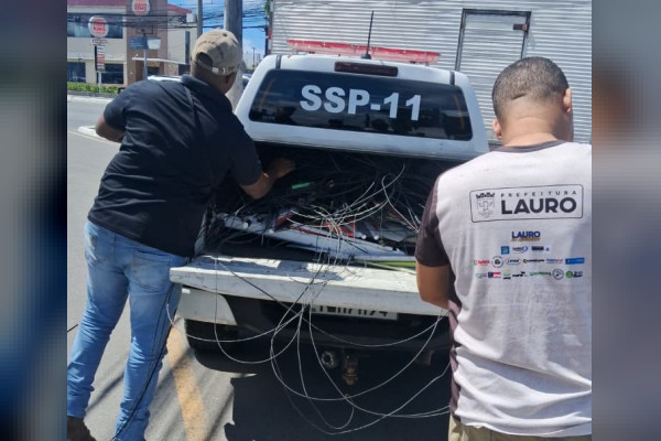 A Prefeitura de Lauro de Freitas, por meio da Secretaria Municipal de Segurança, Defesa Civil e Ordem Pública (SSPLF), realizou, na sexta-feira (17), mais uma etapa da Operação Visão Limpa. Durante a ação, foram retirados 100 kg de cabos e fios inutilizados de postes nos bairros de Buraquinho e Miragem, que vinham causando poluição visual no município.
